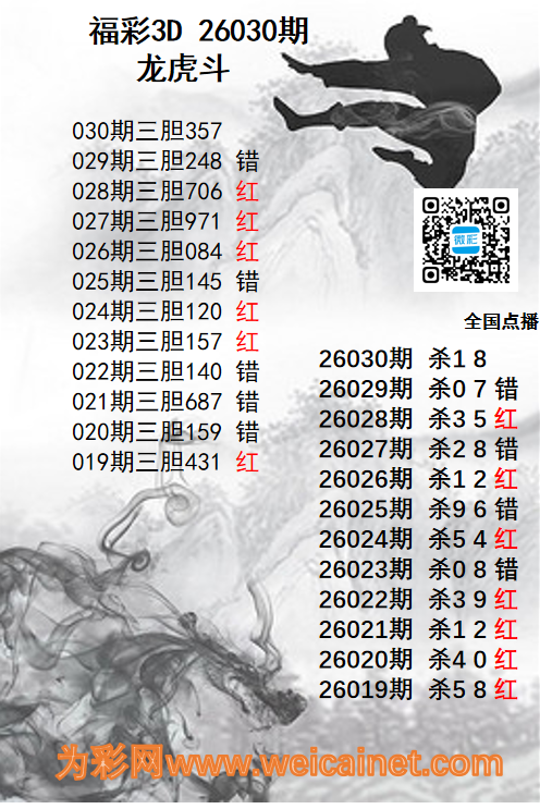 • 福彩3D26030期龙虎斗胆码 杀码图