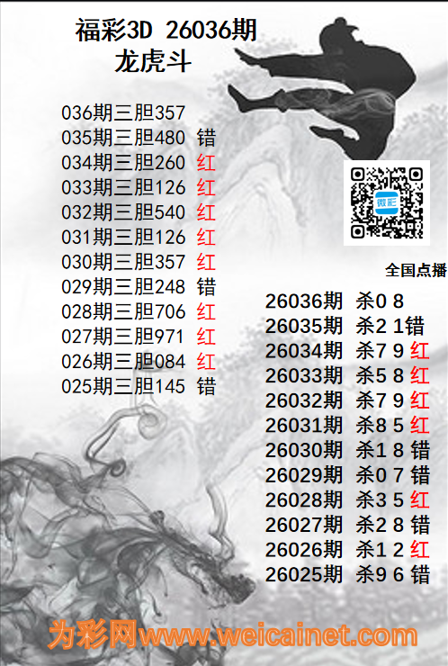 • 福彩3D26036期龙虎斗胆码 杀码图