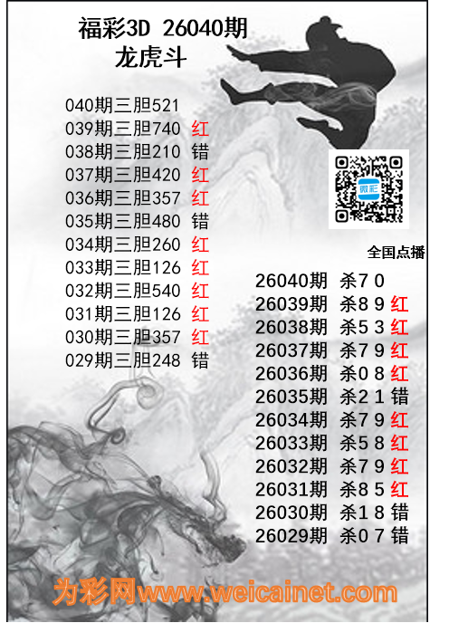 • 福彩3D26040期龙虎斗胆码 杀码图