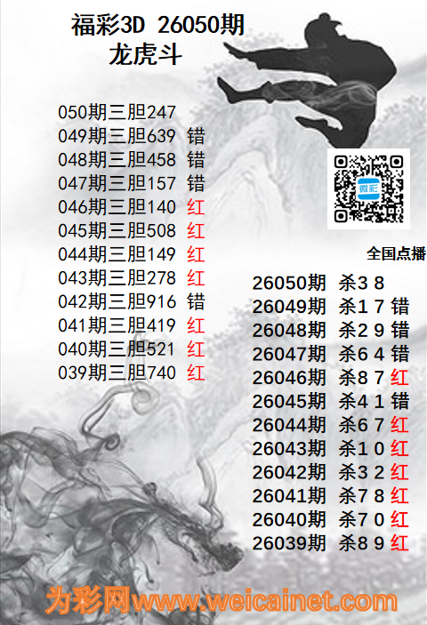 • 福彩3D26050期龙虎斗胆码 杀码图