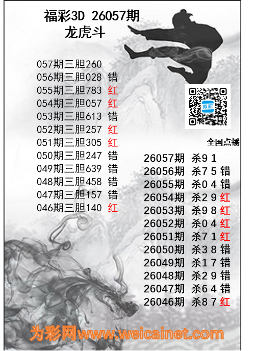 • 福彩3D26057期龙虎斗胆码 杀码图
