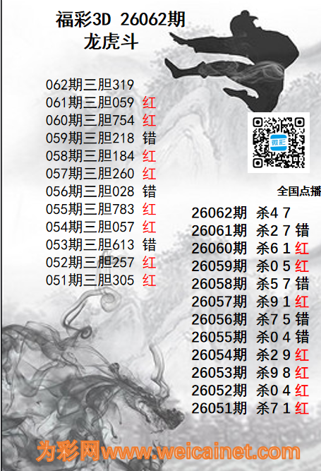 • 福彩3D26060期龙虎斗胆码 杀码图