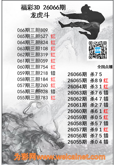 • 福彩3D26066期龙虎斗胆码 杀码图