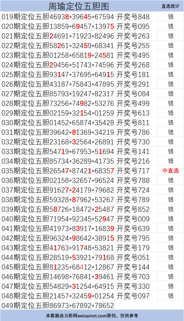 • 排列三26049期胆码 周瑜定位五胆图