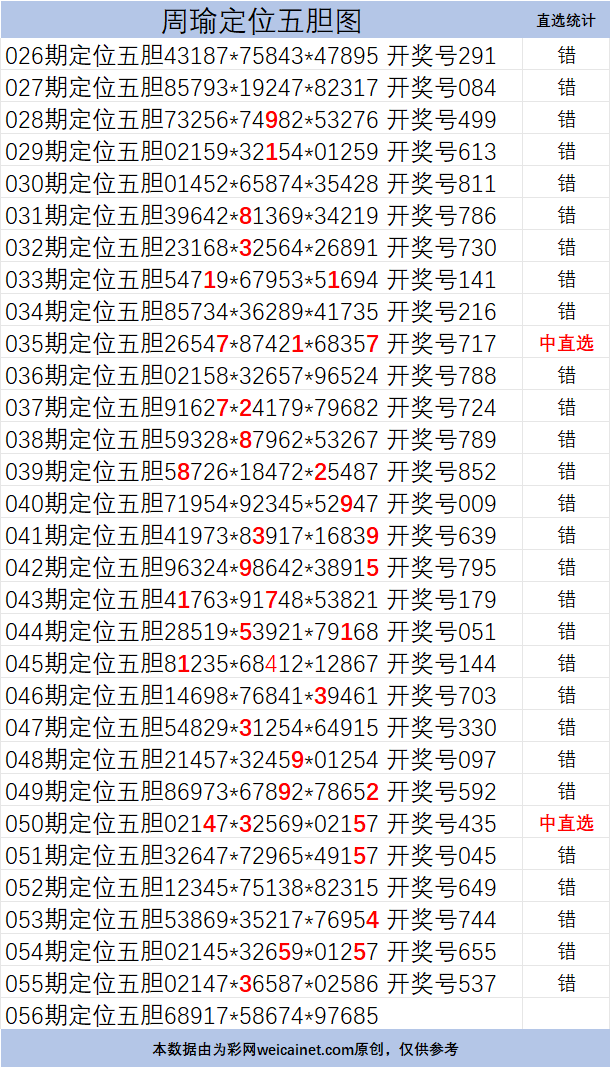 • 排列三26056期胆码 周瑜定位五胆图