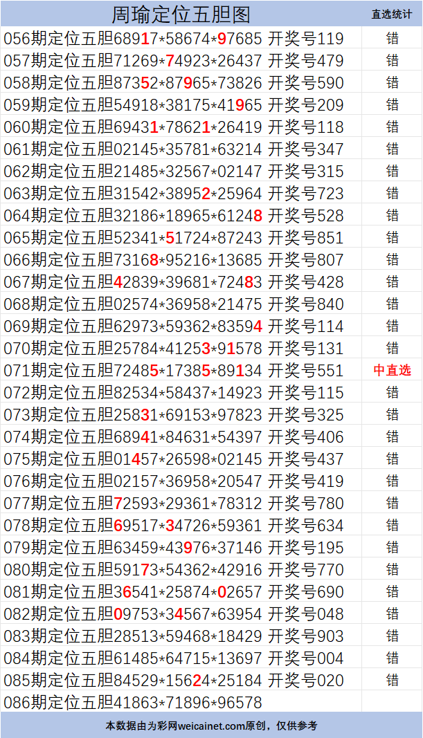 • 排列三26086期胆码 周瑜定位五胆图